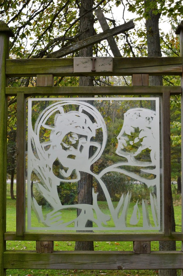 Note2: The art: Glass etched Stations of the Cross; photo: The First Station.